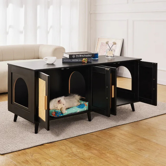 Voir le produitMeuble cache bac à litière pour 2 chats armoire en bois déco rotin noir